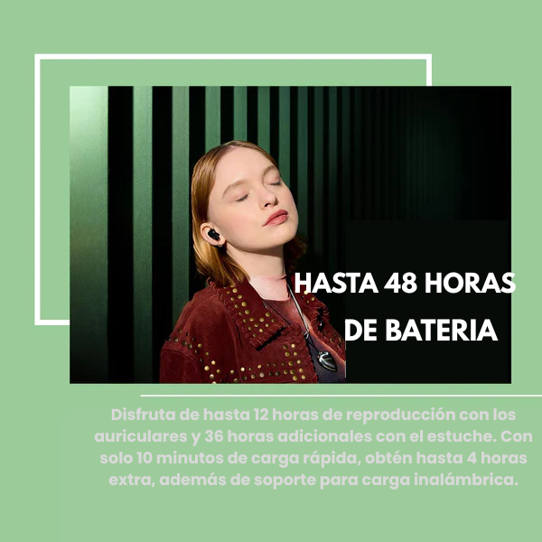 Ofrecen hasta 48 horas de autonomía combinando auriculares y estuche. La carga rápida permite obtener 4 horas adicionales de uso en solo 10 minutos, y también son compatibles con carga inalámbrica, ofreciendo total libertad y practicidad.